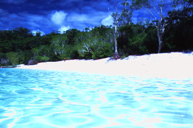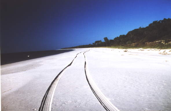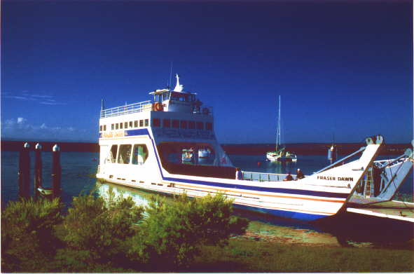 Tag 11: 23.03.00 Früh im 7 werden wir mit einem Bus abgeholt und zur Fähre gefahren. Die Überfahrt dauert ca. 1 Stunde. Wir legen direkt am puderzucker feinen weißen Sandstrand an und steigen in einen Allradbus um. Diese Tour beim Veranstalter TOP TOURS hat pro Person 70 A$ gekostet und ist jeden Dollar wert !