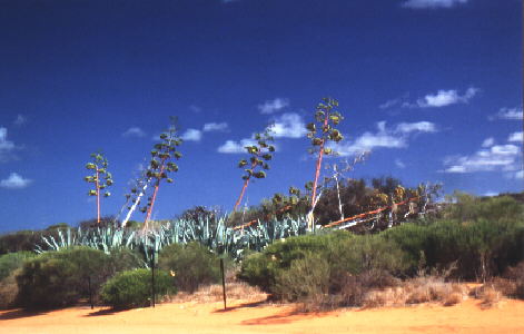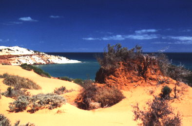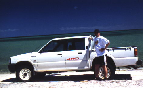 12. Tag: 15.03.01 Um 9:00 Uhr bringt man uns das Allradfahrzeug (einen Mazda 4WD). Toller Service ! Man erklärt uns genau worauf wir achten müssen und checkt den Wagen auf evtl. Beulen. Da es sowieso rundherum schon zerkratzt ist müssen wir uns darüber keine Gedanken machen, denn wir werden auf unserer Tour durch den "Francois Peron N.P." etliche Büsche küssen ! Tipp: Diese Tour sollte man auf keinen Fall mit einem Geländemietwagen von den normalen Autovermietern (BRITZ, KOALA, usw.....) machen da Schrammen vorprogrammiert sind und man dort meist immer eine Selbstbeteiligung hat. Es hat sich für uns mal wieder bestätigt nicht für die gesamte Tour ein Allradfahrzeug zu mieten. Die Miete dafür ist 3 x so hoch wie für einen normalen Wagen !
