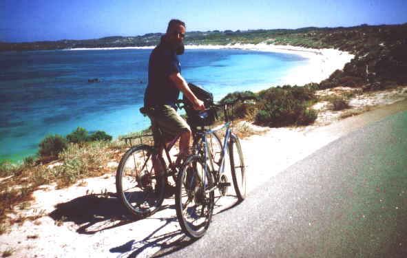 15. Tag: 18.03.01 Wir entschließen uns spontan etwas für unsere Figur zu tun und buchen einen Tagestrip mit einem Schnellboot nach Rottnest Island (1/2 Stunde Fahrtzeit ab Fremantle für 38 A$ pro Person). Auf dieser kleinen Insel vor Perth leben Mini-Kangaroos (nicht höher als 30 cm). Danach wurde die Insel benannt. Die Menschen früher dachten es wären Ratten... Die Fähre ist so schnell das sich ein Kind übergibt, lecker ! Auf der Insel kann man sich nur mit dem Fahrrad bewegen,. Wir mieten uns 2 Mountainbikes und los geht es... leider HELMPFLICHT. Das ist kein Scherz !!