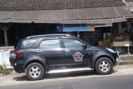 Da wir zwischendurch auch noch ein paar Sachen anschauen möchten handeln wir mit dem Fahrer einen Festpreis 450.000 IDR aus (~40 €). Orientiert haben wir uns an dem Preis was das Hotel für die Strecke nehmen würde (550.000 IDR ohne Stops). Somit sind wir ganz zufrieden und düsen um 9:00 Uhr los. Komank, so heißt unser Driver, ist ca. Anfang 20 und darf schon das Sheriff-Mobil steuern. Einen coolen Jeep die auch die Schlaglöcher erträglich macht. Und selbst an der Tankstelle ist ein Fotostop angesagt...J
