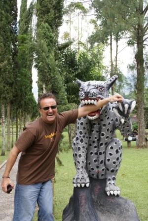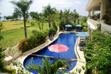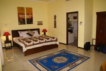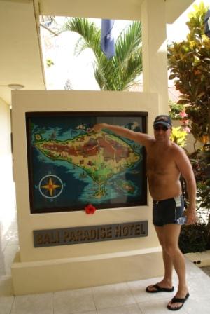 Um 13:00 Uhr kommen wir dann in Lovina an. Unser vorgebuchtes "Bali Paradise Hotel" liegt irgendwo im Nirgendwo. Ca. 500 m abseits der Hautstraße und 100 m vom Strand entfernt, inmitten von Reisfeldern. Idyllisch, aber um hier 12 Tage auszuharren, wie ein deutsches Pärchen, was dort nach einer anstrengenden Chinareise verschnaufen will... na, ich weiß nicht so recht. Das kann man auch übertreiben. So viel Stress kann man doch gar nicht gehabt haben im Urlaub. Norbert zeigt mal auf der Karte wo der Ort liegt.