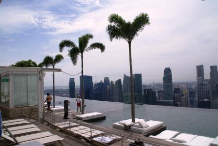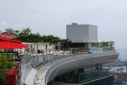 "Das Marina Bay Sands ist ein Casino mit angeschlossenem Hotel in der Marina-Bucht (Marina Bay) von Singapur. Auf den drei Hoteltürmen befindet sich eine 340 m lange Plattform, die u. a. einen Park mit Swimmingpool beinhaltet. Der Ausleger ragt in 200 m Höhe 66 m weit über freien Grund. Das Bauwerk wurde von dem Architekturbüro Aedas aus Abu Dhabi (Vereinigte Arabische Emirate) entworfen" (Auszug aus Wikipedia) Da heute Sonntag ist stehen wir schon 20 Minuten später vor dem Gebäude.... Wow !!!! Wir lösen uns Tickets für den Fahrstuhl zur Aussichtsplattform im Keller des 1. Turms. Dort auch Null Wartezeit. Der Spaß kostet 20 SING$. Wir haben unsere Badesachen zwar auch in der Hosentasche, aber wie schon vermutet, ist der Pool oben nur "for Hotelguests only" ;-((