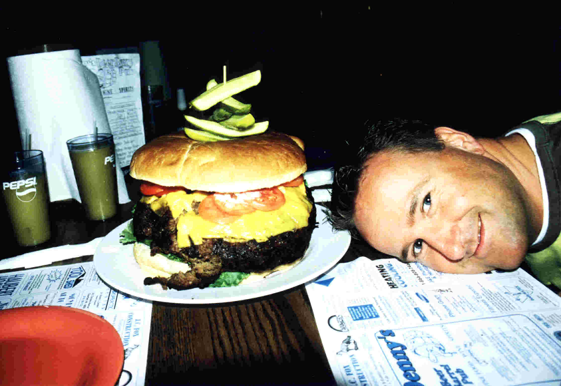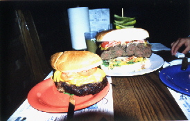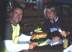 Wir nahmen uns vor den riesigen "THE YE OLDE 96er Burger" zu zweit zu verdrücken der sonst 8 Leute satt macht. Wenn man es schafft ihn alleine in 3 Stunden aufzuessen dann bekommt man ihn umsonst ( Es hat bisher noch KEINER geschafft !!!!) Als wir um 19:00 Uhr dort ankamen um ihn zu bestellen