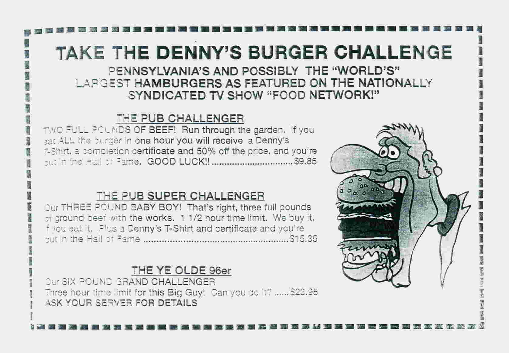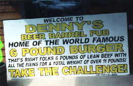 Nicht nur Leute aus NY oder Chicago kommen extra nach Clearfield um im "Dennysbeerbarrelpub" den größten Hamburger der Welt zu Essen.... sondern auch wir !!!!!!!!!!! Ich glaube wir waren seit langem die ersten deutschen Touristen in diesem Ort und wurden überall sehr sehr herzlich empfangen. Die Speisekarte: