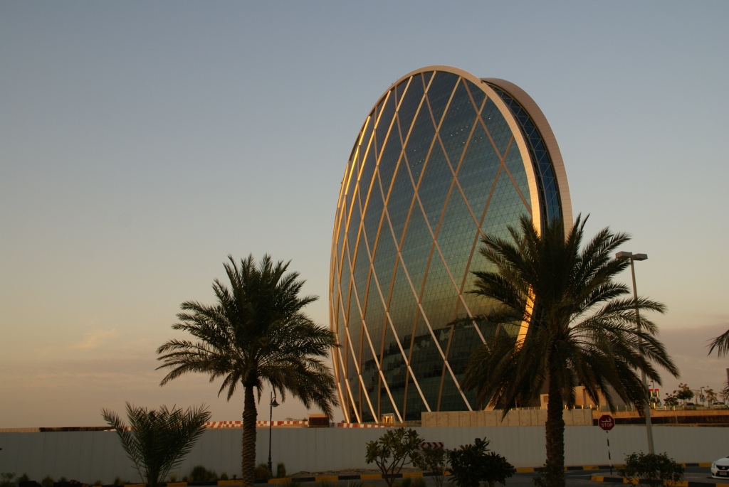 Um 17:00 h verschwinden wir wieder, denn es wird langsam frischer. In dem Park gibt es übrigens auch 2 große Fön-Kabinen (für jeweils 3 Personen) wo man sich für 10 AED (~ 2€) trockenföhnen kann. Wir fahren noch zum Al Racha Beach mit seinem spaceigen, runden Hotel. Im Sonnenuntergang ein echter Hingucker !