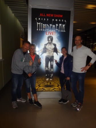 Mittwoch, 28.03.2018 LAS VEGAS "RELAX" mit Claudi & Markus Claudi & Markus sind noch einen Tag länger mit uns in Vegas. Da Criss Angel bei uns im LUXOR Hotel auftritt bekommen wir als Hotelgäste einen Sonderpreis. Das nutzen wir aus und buchen uns für heute Abend schnell noch Tickets. Was man hier für 100 $ an Shows bekommt ist echt toll. Nirgendwo mehr als in Las Vegas gibt es mehr Cirque du Soleil Shows auf der Welt an einem Ort. Hier ist für jeden was dabei. Wir haben uns diesmal für eine Zaubershow entschieden mit Akrobatikelementen und guter Rock-Mucke.