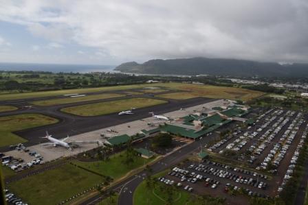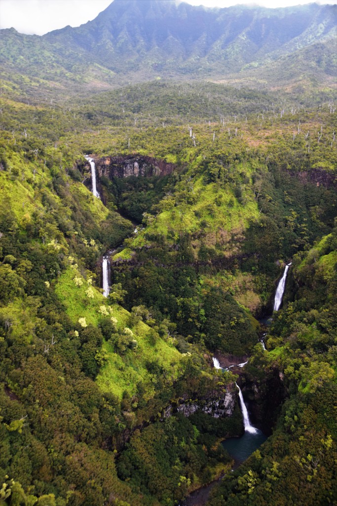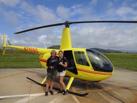 Dort werden wir vorab mit einem Film mit den wichtigsten Dingen vertraut gemacht. Alles sehr professionell. Dann werden wir mit einem Minivan zum Flughafen gebracht wo die Helis starten. Dort gibt es auch noch einmal eine persönliche Einweisung. Unsere Pilotin ist eine junge Australierin und hat dort erst im Office gearbeitet. Sie war so fasziniert das sie den Helicopterschein machte und seitdem mit Leidenschaft die Touristen durch die herrliche Landschaft fliegt. Sie ist sehr locker drauf und wir fühlen uns gleich wohl bei ihr. Airport Kauai von oben, süß... . Als wir über dem Meer starten sehen wir 2 x einen Wal in die Luft springen :-)) Was für ein Erlebnis was wir leider bildlich nicht festhalten konnten. Die Pilotin selbst meinte das man so etwas auch hier selten beobachten kann. Somit hat sich der Flug schon jetzt, kaum sind wir gestartet, gelohnt :-) Wir fliegen nun über eine tolle grüne Zone wo die Baumkronen von oben wir ein Puzzle ausschauen. Natürlich sind wir nicht die einzigen. Das Unternehmen hat mehrere Helis.
