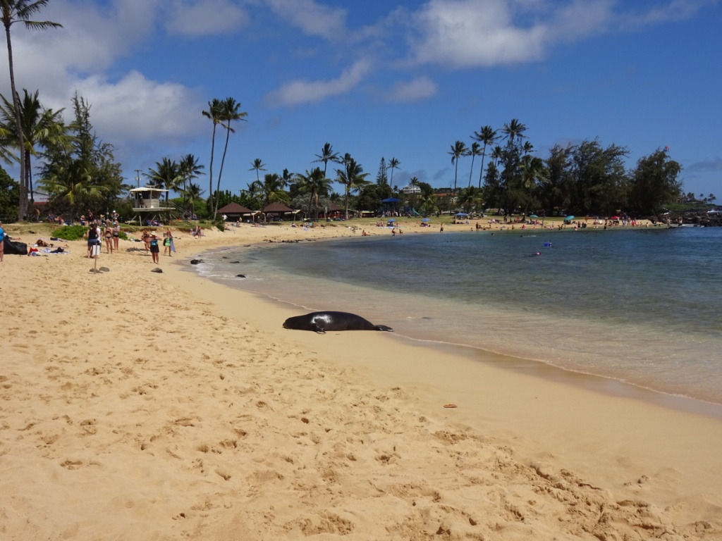 Vorbei an farbenfrohen Foodtrucks erreichen wir Poipu Beach. Hier ist das Wetter zum Baden am beständigsten. Hier relaxen wir den Nachmittag.