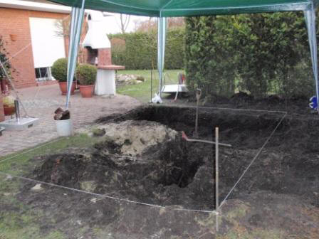 1. Aushebung bis kurz vor Grundwassergrenze Loch mindestens zu allen Seiten 70 cm mehr als der Pool selbst sein wird ausheben incl. Böschung erstellen. Wir stecken mal so vage ab was wir abtragen müssen. 2. Innen muss eine Drainage gelegt werden damit der Grundwasserspiegel im Becken etwas gesenkt wird 3. Die Bodenplatte wird wegen dem Auftrieb durch das Grundwasser zu allen Seiten ca. 30 cm überstehen. Somit verhindert man ein "aufschwemmen" des Beckens wenn man das Wasser ablässt. Außerdem haben wir uns Gedanken um die Herstellung einer wasserfesten Bodenplatte und der Abdichtung innen und außen gegen das Grundwasser gemacht. Wie genau und was es sein wird schreibe ich dann wenn es soweit ist. 22.03.2009 Heute verteilen wir bestimmt 15 Schubkarren Mutterboden auf unserem Grundstück. Gut das wir ne neue Schubkarre haben, die alte für 12,95 € von PRAKTIKER haben wir in Rente geschickt. Sie darf am Rand zusehen. 24.03.2009 Heute früh schneit es megagroße Flocken. Wir haben schon Angst das der Schnee unseren Pavillon, den wir gestern mühevoll aufgebaut und gegen norddeutsche Stürme gesichert hatten, eindrückt. Aber zum Glück bleibt er nicht liegen. Gestern ist auch der Container für den Boden eingetroffen. Jetzt geht es los !! Norbert und Matze sind ordentlich am schaufeln. Zwischendurch kommt eine Nachbarin und fragt nach Mutterboden, klar, kann sie haben, aber nicht vom Container - selbst ist die Frau ! Somit waren wir wieder 3 Schubkarren los. Hier der Erfolg des 1. Tages: