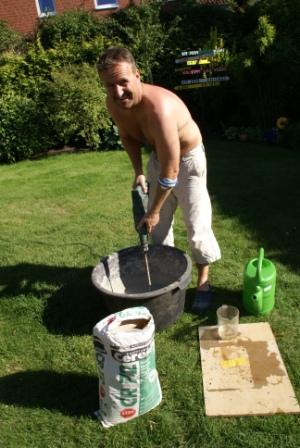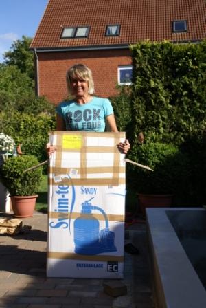 Im riesigen Karton befand sich die Sandfilteranlage "Sandy 50" von Swim-tec mit "BADU Picco Pumpe 5" von der Fa. Speck die mit Saug- und Druckanschlüssen DN 38 mm ausgestattet ist. Das passt hervorragend zu unserer Verrohrung. Das gute ist, wenn man die Pumpe beim Poolpowershop kauft, bekommt man bei Ausfall in der Zeit der Reparatur sofort eine Ersatzpumpe gestellt. Die Reparaturzeiten sind sehr kurz und man muss keine Angst haben das der Pool "umkippt". Toller Service, den wir aber hoffentlich nicht so schnell beanspruchen müssen. Norbert mit seiner neuen Freundin "Sandy" Trotz unseres Mini-Beckens mussten wir doch etwas tiefer als gedacht in die Tasche greifen da die Pumpe über den Wasserspiegel steht und sie selbstansaugend sein muss.