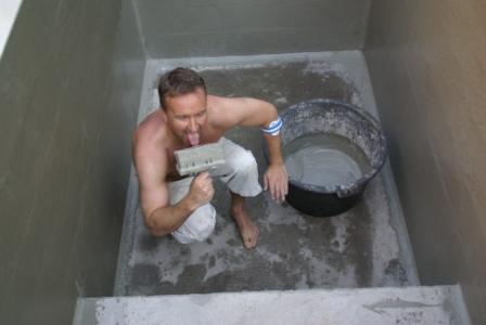 Abends haben wir noch das gute Wetter genutzt und die 1. Schicht der Innenabdichtung aufgetragen. Dafür benutzen wir, wie auch schon außen, die "CR 72 Flex-Dichtschlämme" von der Firma CERESIT.
