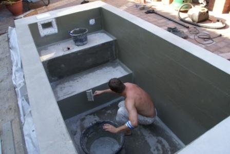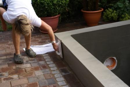 27.06.2009 Ingesamt 4 Schichten der Flex-Dichtschlämme haben wir in den letzten Tagen aufgebracht um das Becken auch von innen wasserdicht zu machen. Die letzte haben wir "gefilzt" damit die Schwimmbadfarbe besser hält. Da außen auch gestrichen wird haben wir auch den Rand noch gefilzt. Das wurde uns vom Farbenhersteller empfohlen. Nun werden wir diese noch 4 Tage trocken lassen und dann die Farbe aufbringen.