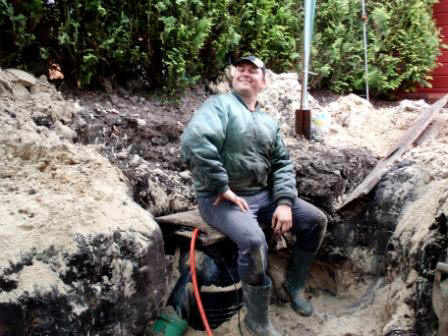 Schacht ein. Da er noch mal 40 cm tiefer als die Drainageleitung liegen muss, um