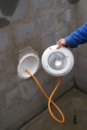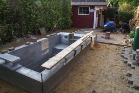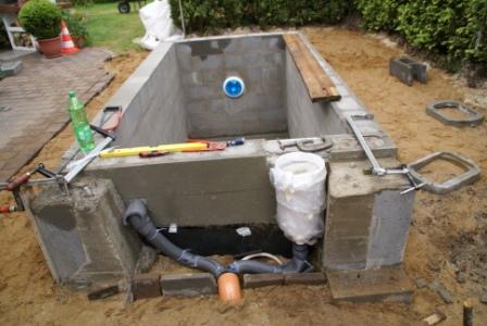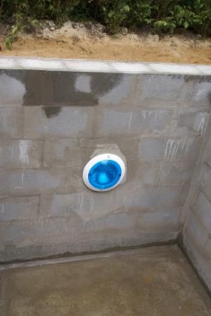 Beim Einbau des Scheinwerfers muss man darauf achten das noch mindestens 1 m Kabel im Scheinwerfertopf verbleibt damit man nachher gut über der  Wasseroberfläche die Birne auswechseln kann. Norbert ist am Fluchen weil es doch ein paar cm mehr sind und das Kabel recht starr ist. Aber nach viel Fummelei ist das Ding erstmal in der Nische. Auch die schicke Farbscheibe haben wir auch schon raufgeschraubt. Der Skimmer und die Wanddurchführung der Einlaufdüse verschwinden in einer Verlängerung der Kante, die als Technikschacht "missbraucht" wurden. Die Verrohrung wird mit einer Isolierung gegen Frost geschützt smilie_wet_059.gif.
