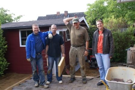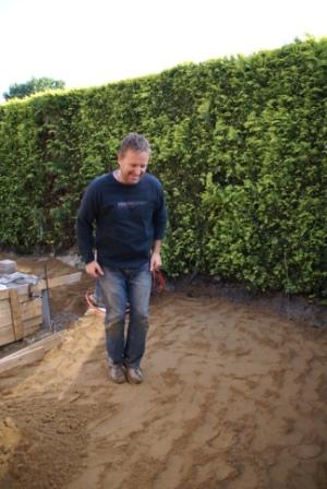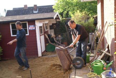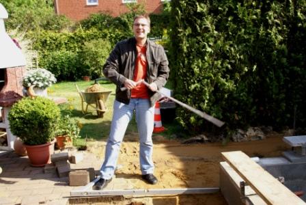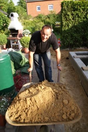 Heute unterstützt uns "Iron-Man"  Nils, der das Training heute mal an der Schubkarre ausübt. Er hat in Rekordzeit die restlichen 3 to um den Pool verteilt und bestimmt 3 Liter Schweiß gelassen.