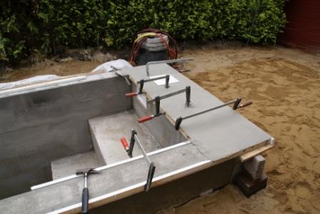 Für die Kanten haben wir gerades Holz besorgt und dieses, weil es Zementmilch nur in riiiiesen Gebinden gibt (nix für den kleinen Handwerker), einfach mit Farbe gestrichen damit das Wasser des frischen Putzes nicht ins Holz einsaugt. Das war neulich unser Fehler. Dank´ des Tipps von Antonius aus dem Poolforum mit dem Beschichten des rohen Brettes sind wir jetzt wieder schlauer. Er hat uns auch noch geraten Gewebeeckwinkel einzuarbeiten. Das wäre natürlich das allerbeste gewesen. Leider sind die Kanten zur Seite schon verputzt und mit Schlämme gestrichen. Nachher ist man schlauer...  Mit Schraubzwingen haben wir das dann über Nacht aushärten lassen.