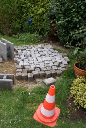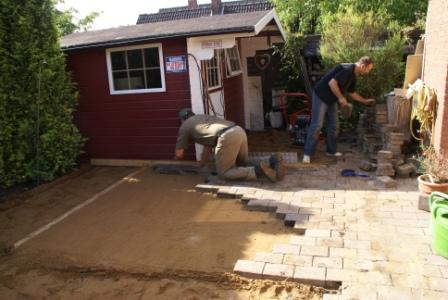 Dann haben die Jungs schon mal angefangen das Pflaster zu verlegen. Und das machen sie richtig gut. Vielleicht sollten sie alle zusammen eine Kolonne bilden und nebenher Pools bauen.