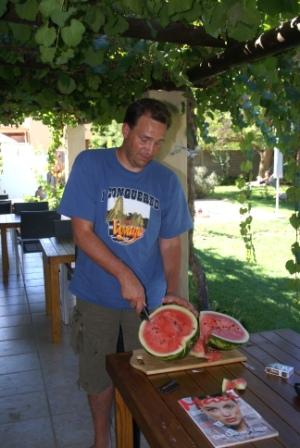 So, nun erstmal zurück zur Lodge und im Pool die gefühlten 50 Grad abkühlen. Olli schlachtet noch eine Melone.