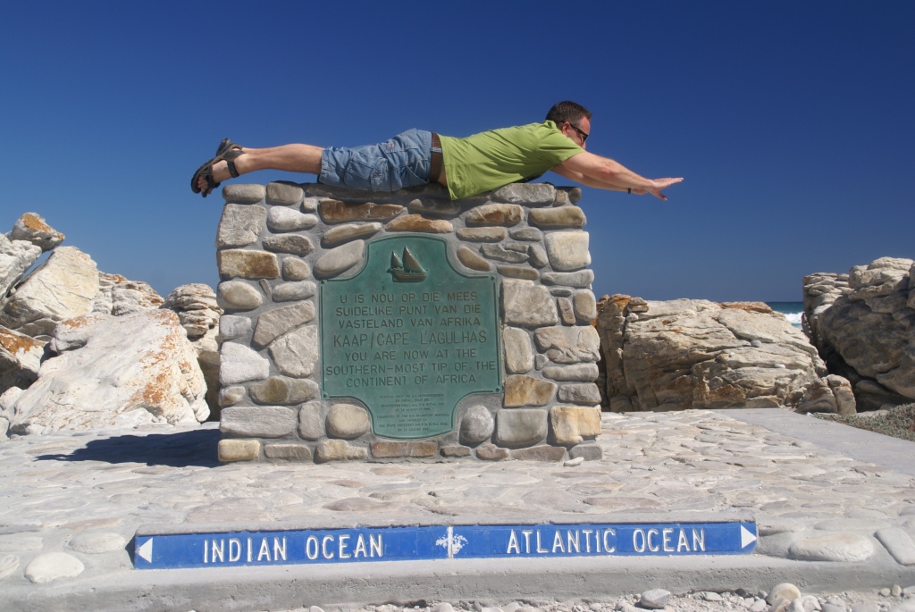 Eigentlich hatten wir Fahrräder reserviert, aber die waren kaputt und wir sollten doch bei den Backpackers im nächsten Ort Stunsbaii (L´Agulhas und Strunsbaii sind fast zusammengewachsene Orte) welche leihen. Dort werden uns allerdingst so schäbigen Moutainbikes angeboten, dass wir nach 10 Minuten die Räder wieder zurückgeben. Da wären welche bei uns von Schrott noch besser, schade ;-(. Der Backpacker-Herbergsvater guckt uns ganz sparsam an. Seine Gäste sind wohl froh sich überhaupt irgendwie fortzubewegen. Aus dem Alter sind wir leider schon raus. Da fahren wir doch lieber mal zum Punkt wo sich der Atlantik und der Indische Ozean treffen. Hier ist richtiger Besucherandrang.