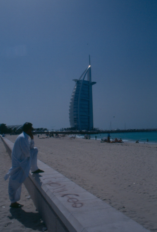 Dann steigen wir ins Taxi und lassen uns von einem Inder bis zum "Burj al Arab" fahren. Das ist das 7*-Hotel was sich wohl jeder Dubai-Urlauber anschaut. Wir sind aber nicht rein. Das hätte was gekostet und man muss sich schick anziehen. Deshalb haben wir es nur vom Strand aus angeschaut. Um an den Strand zu kommen muss man aber durch eins der Strandhotels kommen. Das ist gar nicht so einfach, die Kontrollen sind recht gut. Aber irgendwann schafften wir es doch ;-)