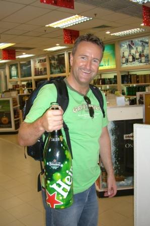 01.03.2007 LANGKAWI => KUALA LUMPUR Pünktlich um 11:45 Uhr hob unser "Air Asia"-Flieger nach Kuala Lumpur ab. Wir flogen für unglaubliche 24 € (für 2 Personen incl. Tax !!!!). Allerdings hatten wir die Tickets schon 2 Monate vorher gebucht als wir unsere Reiseroute planten. Am niedlichen Airport von Langkawi gab es es nicht viel zu gucken um sich die Zeit zu vertreiben. Deshalb schlichen wir durch den Duty free Shop und entdeckten diese riesige Bierflasche. Das wäre eine tolle Deko gewesen. Wir wollten die aber jetzt nicht die ganze Zeit mitschleppen und hofften am Abflugshafen in Kuala Lumpur diese noch mal zu finden.