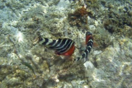 Da wir nun den Weg aber nicht wieder zurückwandern wollten dachten wir das es einfach ist sich einfach ein Boot zu chartern was uns zurück zum Berjaya Resort bringen würde. Das war aber gar nicht so einfach. Irgendwann erklärte sich ein Mitarbeiter einer Tauchschule bereit uns rüber zu fahren. Was allerdings auch nicht gerade billig war. Glaube das waren so umgerechnet 15 € gewesen. Ich hatte das schnell wieder verdrängt... Zurück am Hotel besorgten wir uns erstmal Schnorchel und Flossen und vergnügten uns am Riff.