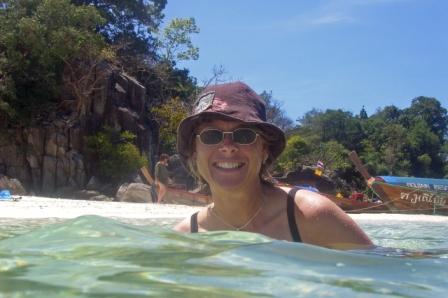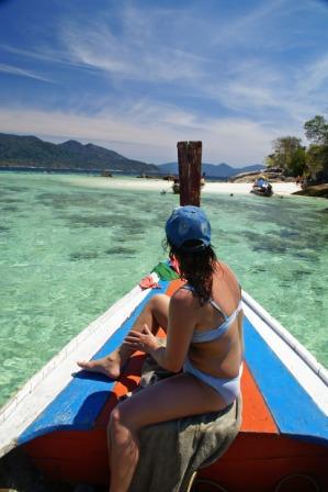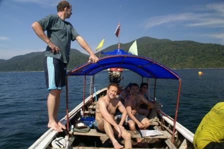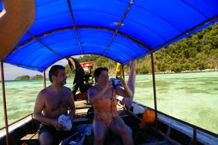Danach trafen wir uns an am Strand unten mit den anderen. Unser Guide mit dem Longtail wartete schon auf uns und wir 6 machten uns auf dem Weg zu unserer Schnorcheltour in de Umgebung. Die Flossen und Brillen hatte er für uns dabei. Annette und ich hatten uns übers Internet noch eine wasserdichte Tasche für unsere kleinen Digitalkameras besorgt. Der Preis für die Taschen war echt unverschämt hoch (allerdings mit Garantie). Ich hatte die Kamera Zuhause in der Tasche schon mal ins Waschbecken gelegt. So wohl war mir nicht dabei. Nicht das mein kleiner oranger "Manni" im Wasser sterben muss. Manche mögen mich für verrückt halten, aber jede Kamera hat bei mir einen Namen nach dem Postboten der sie lieferte. Jetzt fragt Ihr Euch sicher wie denn meine Spiegelreflex heißt... das werde ich im Laufe des Berichtes noch verraten. Also weiter lesen.