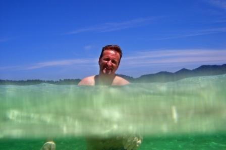 Wir stoppten an einer einsamen Insel. Hier das erste Testbild halb unter Wasser mit dem Aquapac. Gar nicht so schlecht, oder ? Der Strand aber auch nicht...