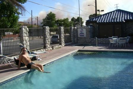 Das Motel in Santa Clarita erinnert etwas an den deutschen "Black Forest". Die Lage des Motels ist ganz gut, allerdings ist der Pool klein, zu warm und dreckig... brr... Wie gut das wir hier nur eine Nacht gebucht haben. Und im Hintergrund haben wir noch ein nettes Feuerchen. Abends gibt es rauchige Rippchen im Restaurant gegenüber... lecker !!! Ich schreibe diesen Reisebericht in 2011 und bin verwundert was ich alles noch weiß ☺☺