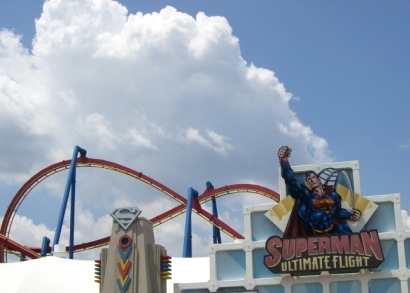 Wir gehen erst zu "Superman the ultimative flight" weil man da sonst immer Stunden anstehen muss. Das ist ein Flyer wo man denkt man fliegt. Gut gemacht, leider etwas kurz von der Strecke. Lohnt sich aber.