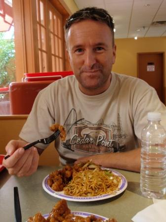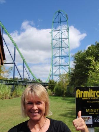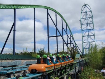 Ein fast baugleicher steht in Sandusky Ohio (Cedarpoint). Dieser ist nur noch etwas höher und hat den Hügel als Bremse.  Leider ist man hier durch Schulterbügel gesichert was nach einigen Fahrten blaue Flecken an den Schultern verursacht (wenn man, so wie wir die Arme hochreißt beim Start). Der Katapultstart ist echt der Hammer. Tja Olli Pocher, da hast Du echt was verpasst !! Das Gefühl ist nicht zu beschreiben was für Kräfte da auf einen wirken. Zum atmen kommt man erst wieder wenn man oben ist und die tolle Aussicht über den Park genießen kann. Dann geht es auch schon gleich senkrecht wieder runter mit einer Drehung. Der Wahnsinn - am besten gleich nochmal.. und nochmal !! Die Wartezeiten halten sich (auch für die 1. Reihe mit ca. 1 Std. in Grenzen). Danach gab es ein gutes Mittagessen bei PANDA EXPRESS. Einer super leckeren Fastfood China-Food Kette. Das Orange Chicken ist da der Hammer. Wir denken gerade an Silke & Olli die das ja auch so lieben und schicken ein paar Grüße rüber nach KAKI !!