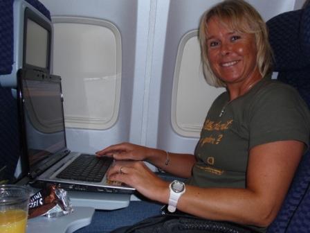 13:30 Uhr: Norbert entdeckt das es Strom fürs Laptop sogar in der Brette-Class gibt !!  (Also Kabel mit ins Handgepäck nehmen !!). Wie gut das ich mir Zuhause keinen 2. Akku gekauft hatte). Gute Bildschirme sind auch in den Sitzen und es gibt auch deutsche Filme.